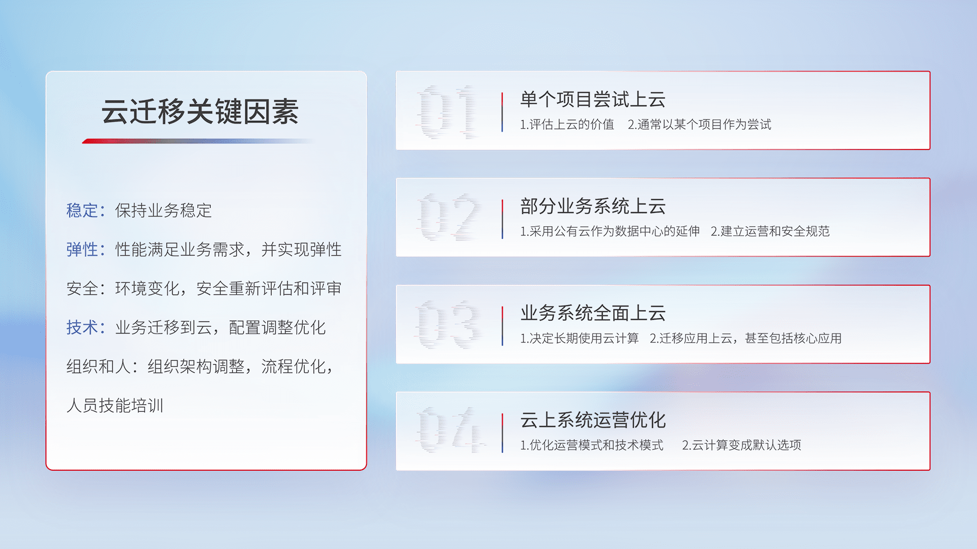 结合实际业务,,,从规划设计、、云平台选型、、、云原生改造、、、数据迁移、、、、集成交付,,迁移全过程为客户识别最佳上云路径,,做好风险识别管理,,设计网络架构、、身份权限、、、安全审计合规、、操作审计、、日志审计、、监控告警策略、、多站点容灾设计等,,,,对云上基础设施进行整体规划,,,,提升IT治理水平,,,以满足弹性、、、、高可用、、、高性能的需求。。。