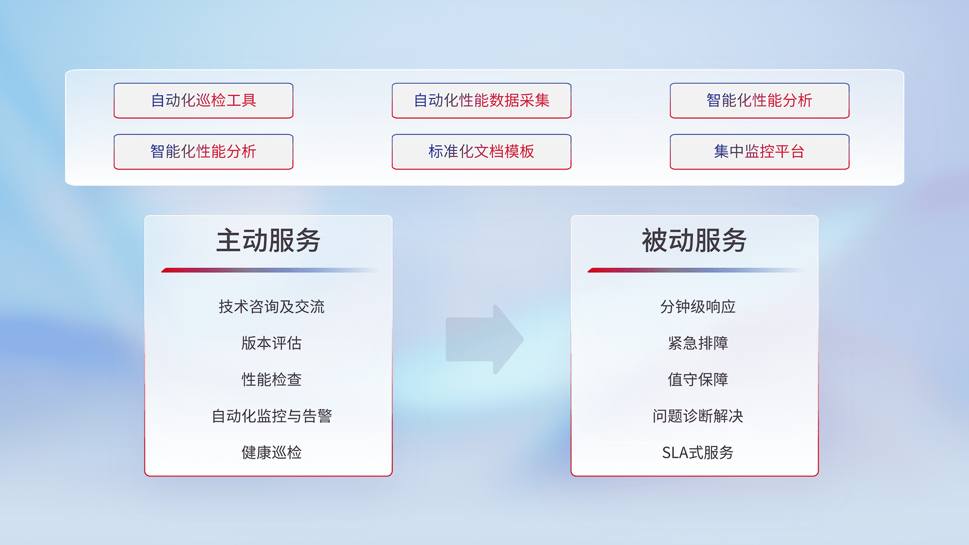 智能化工具和标准化文档,,保障服务质量,,,,提供主动服务(包含技术咨询、、版本评估、、、性能检查、、、、自动化监控与告警、、健康巡检)和被动服务包含(分钟级响应、、、紧急排障、、值守保障、、问题诊断解决、、SLA服务)。。